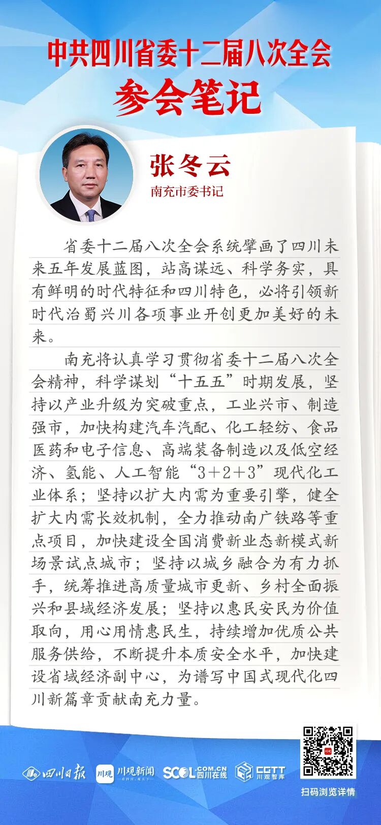省委十二届八次全会参会笔记丨张冬云:科学谋划“十五五”发展 奋力谱写现代化南充建设新篇章来源:川观新闻 南充播报 ![]() ![]() 张冬云 南充市委书记 ![]() 省委十二届八次全会系统擘画了四川未来五年发展蓝图,站高谋远、科学务实,具有鲜明的时代特征和四川特色,必将引领新时代治蜀兴川各项事业开创更加美好的未来。 南充将认真学习贯彻省委十二届八次全会精神,科学谋划“十五五”时期发展,坚持以产业升级为突破重点,工业兴市、制造强市,加快构建汽车汽配、化工轻纺、食品医药和电子信息、高端装备制造以及低空经济、氢能、人工智能“3+2+3”现代化工业体系;坚持以扩大内需为重要引擎,健全扩大内需长效机制,全力推动南广铁路等重点项目,加快建设全国消费新业态新模式新场景试点城市;坚持以城乡融合为有力抓手,统筹推进高质量城市更新、乡村全面振兴和县域经济发展;坚持以惠民安民为价值取向,用心用情惠民生,持续增加优质公共服务供给,不断提升本质安全水平,加快建设省域经济副中心,为谱写中国式现代化四川新篇章贡献南充力量。 |